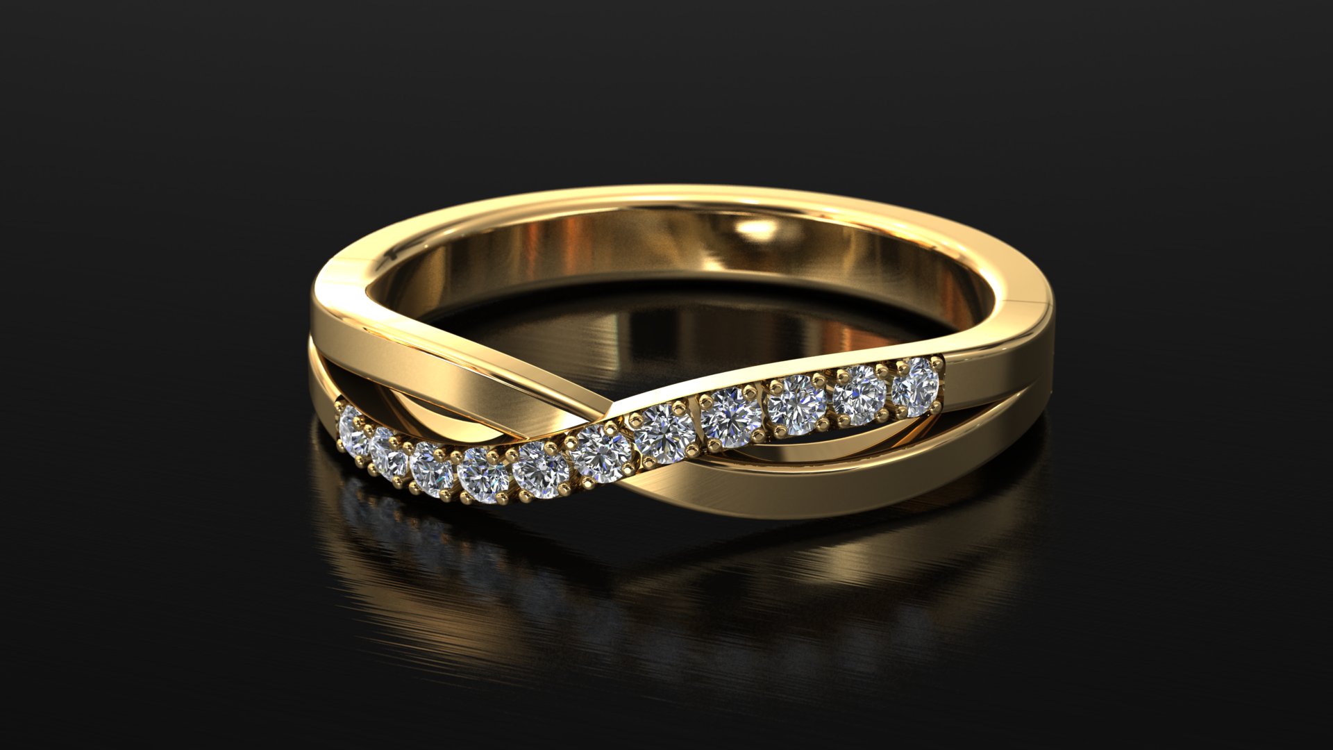 They decided on this piece, a narrow backed band which splits into two sections, with the plain band passing under a row of diamonds which begin alongside it.