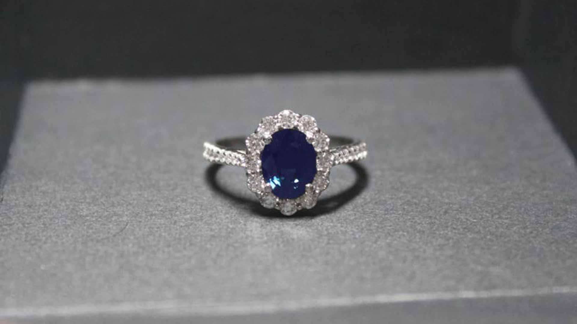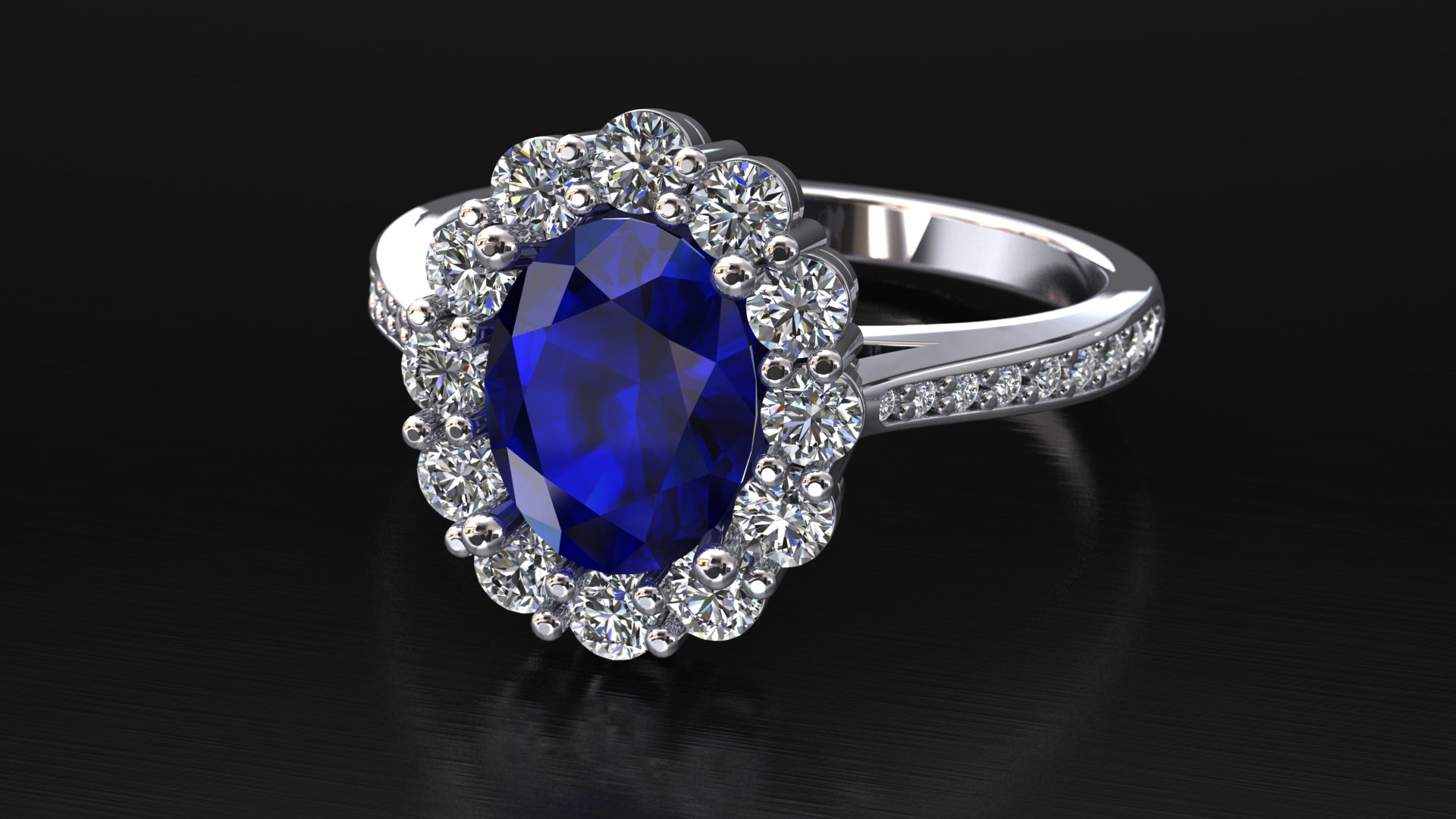 A bright flash of Diamonds across the top and down the band of the ring, surrounding a beautiful oval sapphire. This ring is a design of ours which combines beauty and practicality.